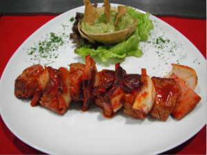 con cebolla, tocino y un adobo especial acompañada de guacamole